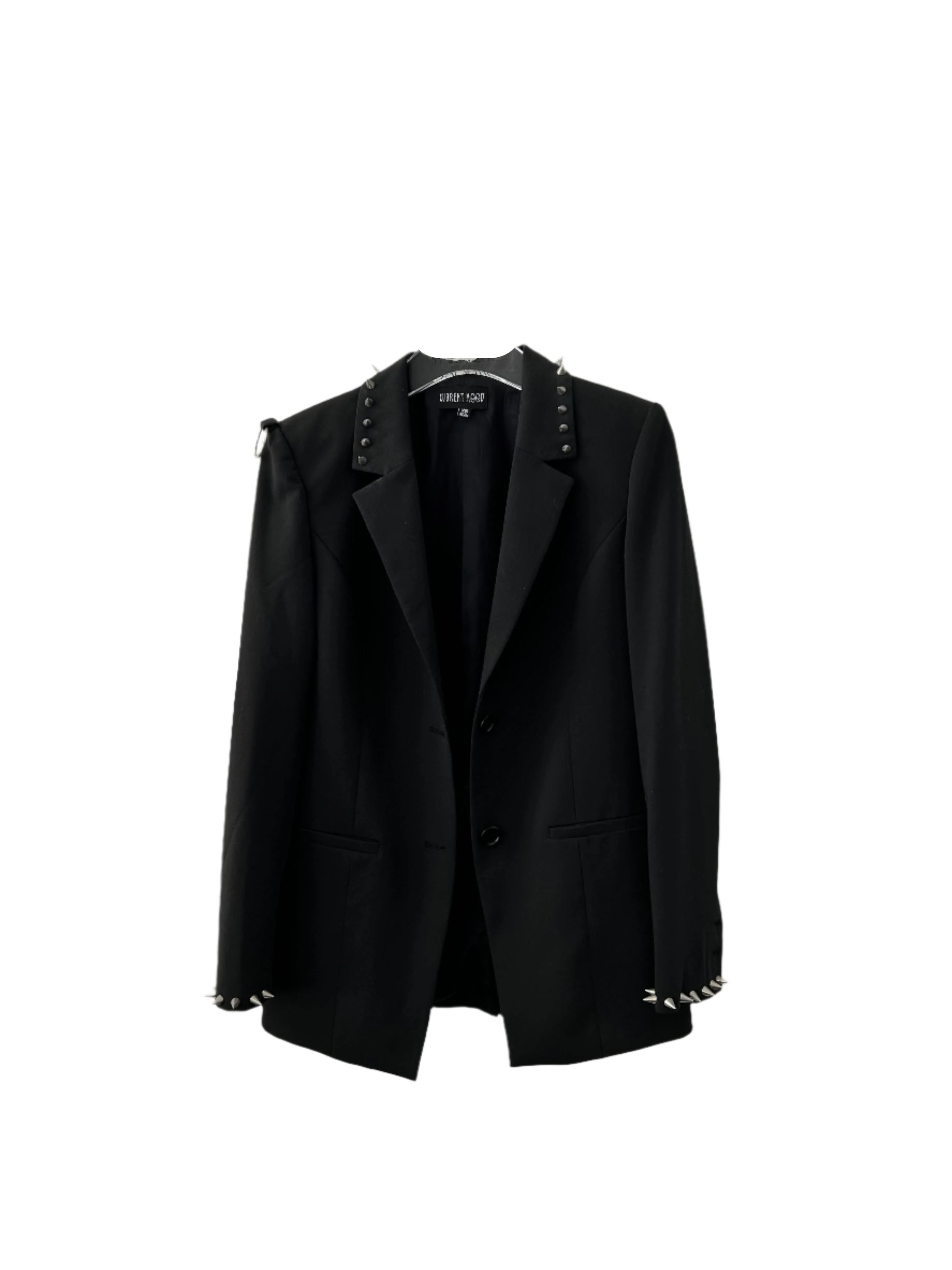 This black suit jacket combines classic tailoring with bold, avant-garde details. Featuring spikes and a distinctive hook on the shoulder, adds an edgy, architectural element to your formalwear. Ideal for fashion-forward occasions where making a statement is essential.